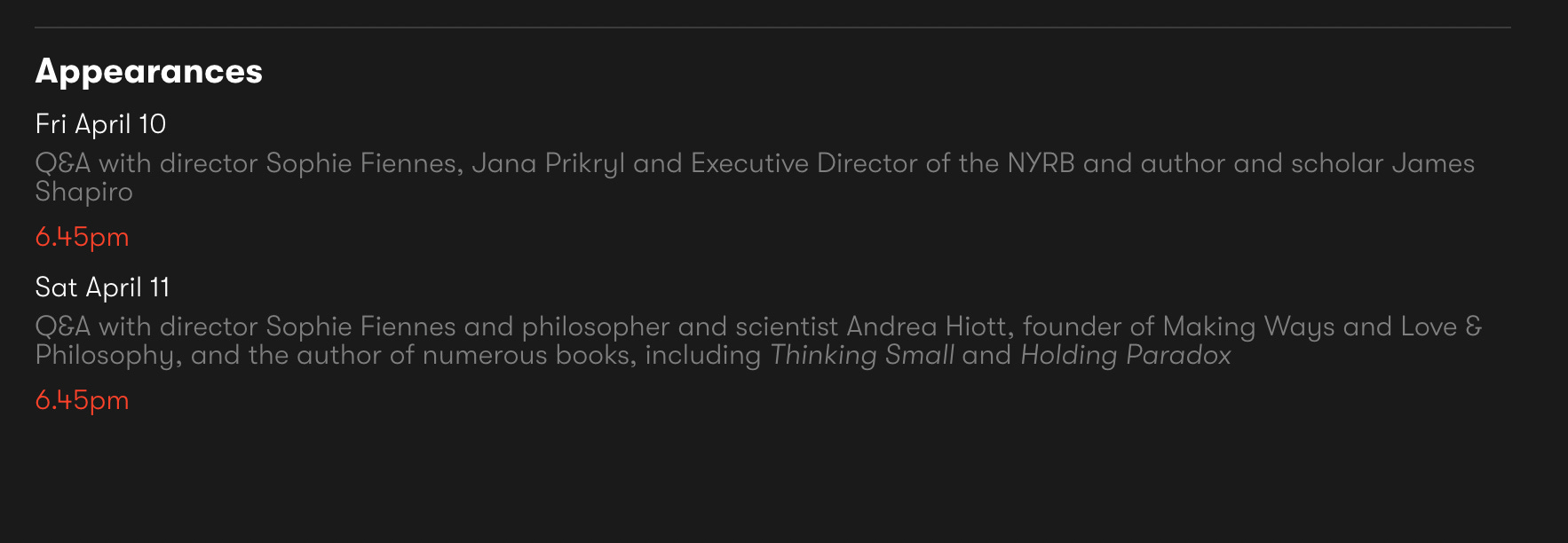 If you’re in New York City, I’d love to see you at one of my favorite places, Quad Cinema, where I’ll have the honor of speaking on a panel with one of my favorite documentary filmmakers, Sophie Fiennes and where you can be among the first to watch the US premiere of her film Acting. I will post more about that soon, but if you’re interested, you can already get your tickets here.